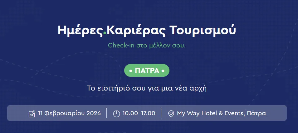 Μετά την επιτυχημένη διεξαγωγή των εκδηλώσεων σε Αθήνα, Θεσσαλονίκη και Ηράκλειο, το kariera.gr φέρνει τις Ημέρες Καριέρας Τουρισμού στην Πάτρα AIROTEL GROUP OF HOTELS | Almyros Beach Resort and Spa | Amanzoe | Atrium Hotels & Resorts | Canaves Collection | Domes | Electra Hotels & Resorts | Ella Resorts | Empiria Group | F ZEEN RETREATS | FODELE BEACH & WATER PARK HOLIDAY RESORT / THE SYNTOPIA HOTEL | Four Seasons Resort Mykonos | Kenshō Hotels | Mar-Bella Collection | Metaxa Hospitality Group | Mitsis Group | Nana Hotels – Όμιλος Εταιριών ΚΑΡΑΤΖΗ Α.Ε | Nikki Beach Resort & Spa Porto Heli | Omicron Hotels | One&Only Kéa Island | Parga Beach Resort | Sani/Ikos Group | Santikos Collection | SWOT ΞΕΝΟΔΟΧΕΙΑΚΗ ΚΑΙ ΤΟΥΡΙΣΤΙΚΗ ΑΝΩΝΥΜΗ ΕΤΑΙΡΙΑ | Tresor Hospitality | TUI | Wavemaker Hospitality | White Rocks Hotel Kefalonia | Xenos Hotels & Resorts | Zuma and ROKA restaurants